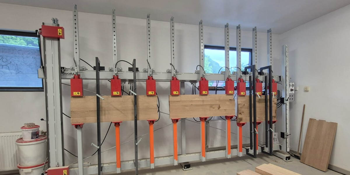 SLR model is determined for gluing frame constructions (windows, doors, etc.) and while using accessories also for desks, glulam beams and cabinets. In standard versions it is usually manufactured for gluing lengths 2 500 - 4 000 mm (possible max. 5 000 mm) and for gluing heights 1 800 - 2 500 mm (possible max. 3 000 mm). Machine consists of welded frame from thick profiles. On the top of the frame rail there are travelling pressing units itselves. Working height is adjustable in raster 100 mm by the bottom supporting feet and also by adjusting the top pressing unit, which is installed on counter-weights for comfortable unit using. Machine control is done from control panel where you can also set the working pressure.